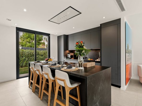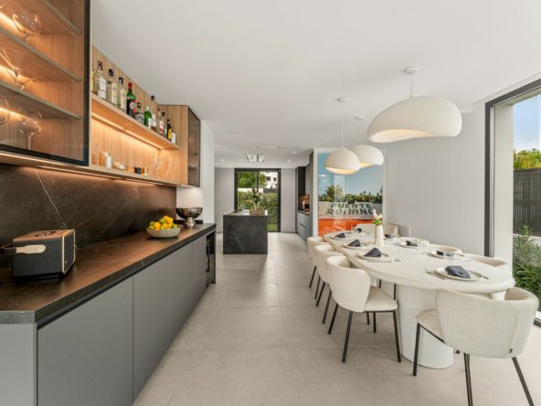 The home features five spacious bedrooms, four of them en suite, along with three additional bathrooms and a guest toilet. Interiors highlight a minimalist yet warm aesthetic, enhanced by high-quality finishes and carefully selected furnishings. At the heart of the villa is an open-plan kitchen and living area. The kitchen, equipped with premium Miele appliances, reflects innovation and quality, while the living space extends seamlessly to a terrace with views of the lush fairways. This integration of indoor and outdoor spaces makes the villa ideal for relaxed family living as well as larger gatherings.