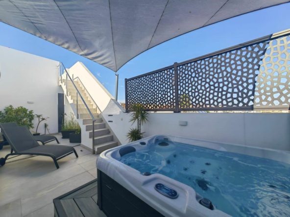A second main bedroom suite, also with walk-in wardrobe and ensuite, shares this floor with a bright, open area for additional storage and a sun terrace complete with jacuzzi, outdoor hot/cold shower, and chill-out zone. Glass doors, open sky, and natural breezes make this a true sanctuary.