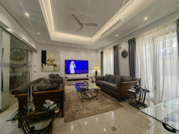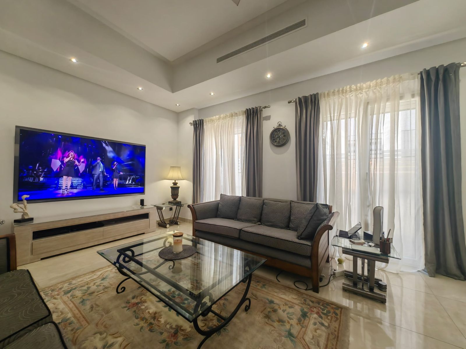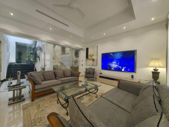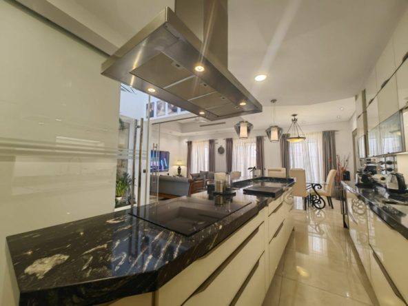 A central feature of the home is the dramatic atrium, rising all the way to the glass rooftop and acting as the light-filled core of the villa. A wide glass door opens into a spacious lounge and TV area, dining room, and a designer Schmidt kitchen fitted with top-of-the-line appliances including a Liebherr refrigerator. This entire floor is bathed in daylight, offering seamless flow and openness.