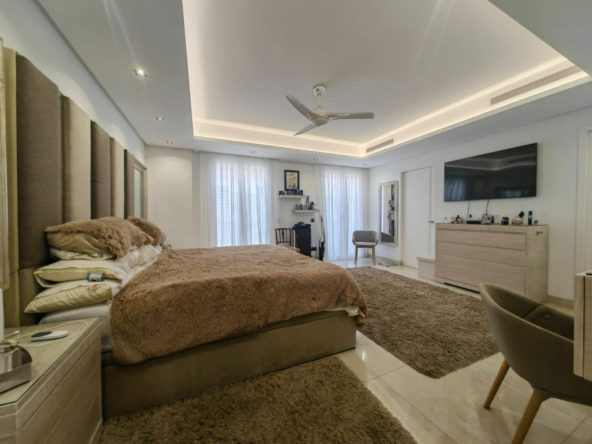 The first main bedroom suite features its own walk-in wardrobe, ensuite bathroom, and access to a wide passageway with extensive built-in storage. The highlight here is the entertainment terrace, blending covered and open-air spaces and equipped with plasma screen, BBQ, second kitchen, LED lighting, and laundry room. It's a space made for alfresco living under the sun or stars.