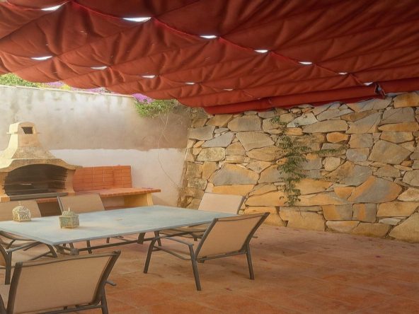 The property features a fully fitted kitchen, an open fireplace in the living area, and a large private terrace complete with a built-in BBQ, perfect for outdoor dining and entertaining.