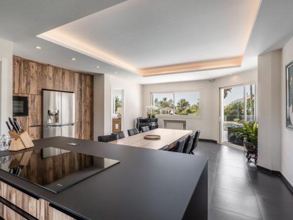 At the heart of the home is a modern, designer kitchen that combines style and functionality, ideal for both casual family meals and sophisticated entertaining. The villa is fully climate-controlled, with air conditioning and central heating throughout, ensuring year-round comfort.