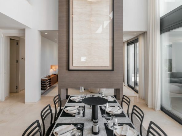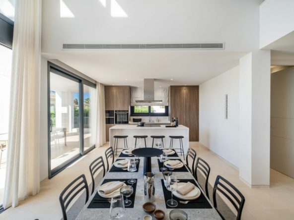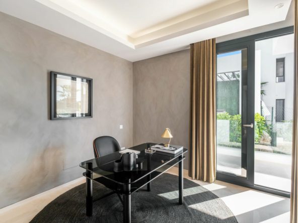 Set on a plot of 802m², the beautiful villa of 582 m² has been designed by renowned architect Pedro Iraburu Elizalde and offers high quality and spacious interior designed rooms with stunning and elegant interior design furniture and styling solutions. The villa is built over 3 levels. The ground floor consists of a large hallway with a guest toilet, an open plan living space that enjoys an abundance of natural light thanks to the large glass windows that open out onto the outdoor area. They lead to a private heated swimming pool, BBQ area as well as private sun loungers. The modern kitchen is fully equipped and has an island and breakfast area. Overlooking the garden,