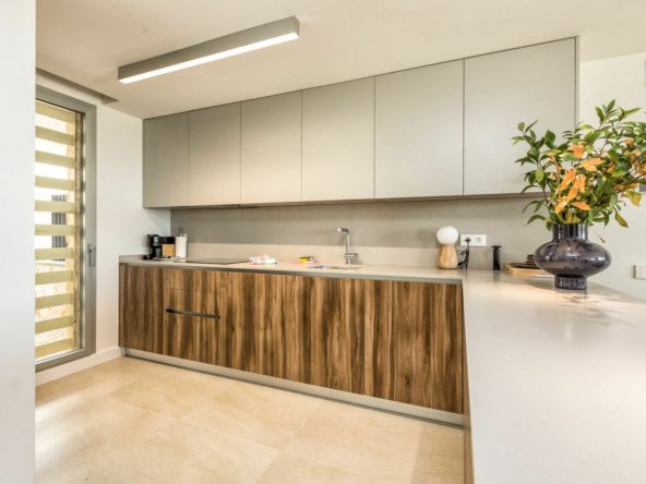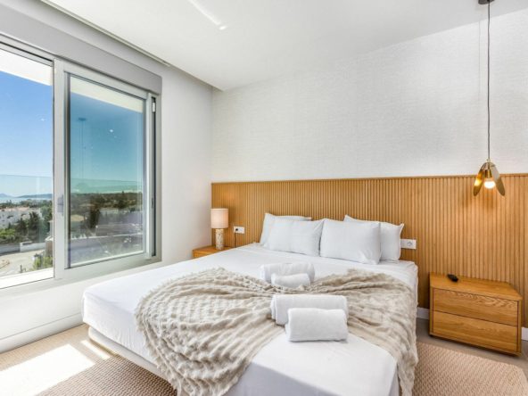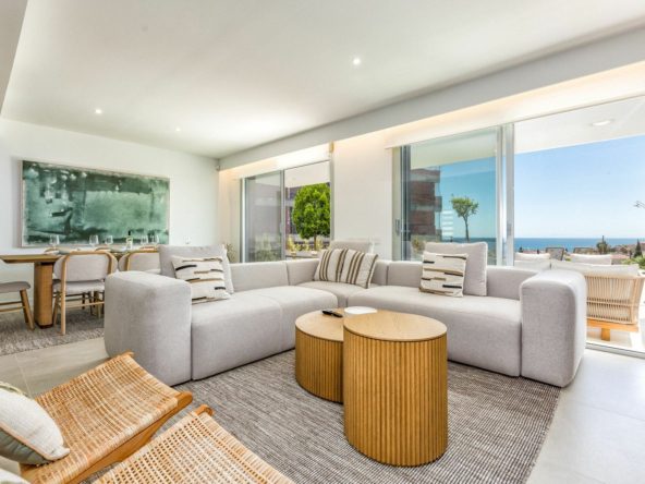Inside, the home offers a bright open plan living and dining space connected to a fully equipped kitchen. Large windows maximise natural light and frame the sea views from the main living areas and terraces.