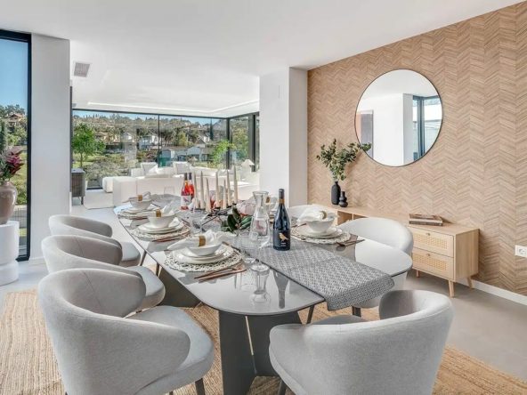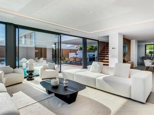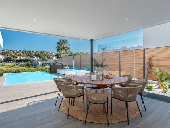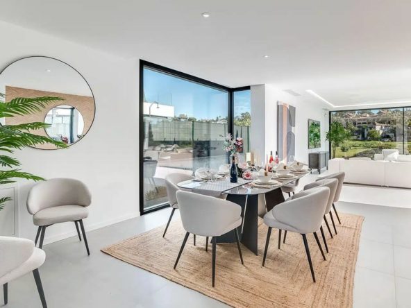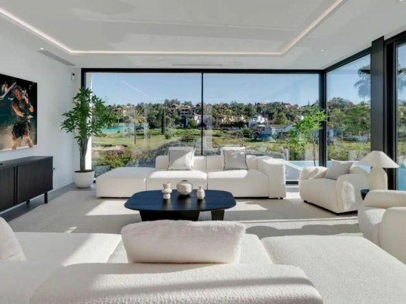 This is a brand new, Scandinavian-inspired home set front line to El Campanario Golf. Just minutes from Puerto Banús, the beach, and top golf courses, this modern villa offers five spacious bedrooms, four en suite bathrooms, and a guest toilet. The open plan living area leads directly to a landscaped garden, a heated infinity pool, and an outdoor dining area with a built-in BBQ.