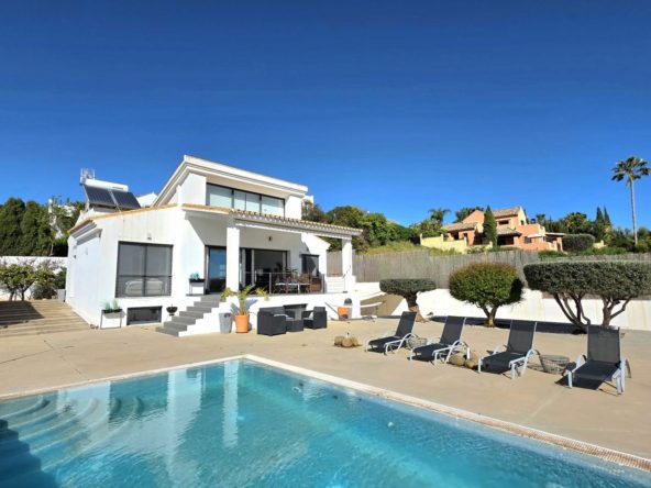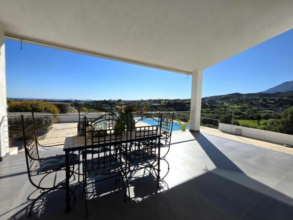 This beautiful, west facing family villa in Estepona has the most amazing panoramic views across the coastline and surrounding mountains. Built in 2016 the house is modern and spacious, with 4 double bedrooms and 3 full bathrooms. The main living area is upstairs with a contemporary, open plan kitchen and large sitting room, with double height domed ceilings, and large terrace doors opening up onto a covered terrace overlooking the pool with views stretching all the way to Gibraltar and Africa. This upper level also houses the master bedroom with dressing room and en suite bathroom as well as a second bedroom and full bathroom with shower, both with beautiful, west facing views. Downstairs are two more bedrooms with a full bathroom and a games room/second sitting room. This downstairs area is also very versatile and could be converted into a cinema room, gym, further bedroom or office area if needed.