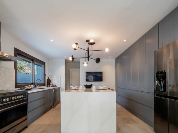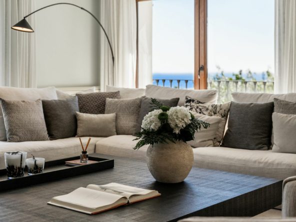 Outdoor living is a key feature, with expansive terraces, an outdoor kitchen and bar, landscaped gardens, and a private swimming pool, all set against a beautiful natural backdrop and stunning sea views. A private garage and separate access complete the property.