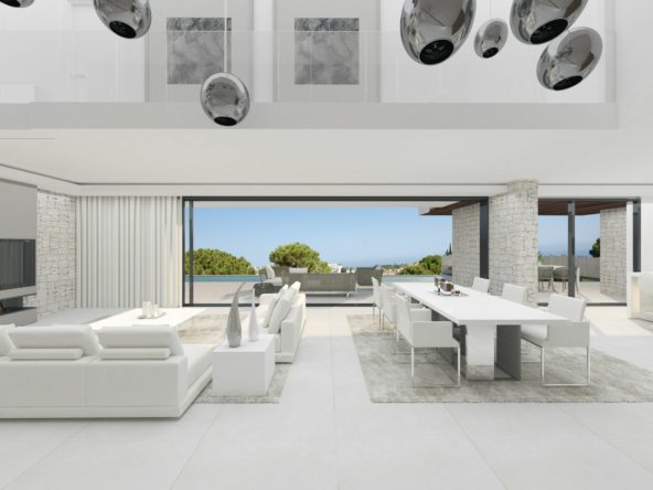 This modern-style villa stands out for its seamless connection between indoor and outdoor spaces, large windows that flood the interior with natural light, and views of the Mediterranean landscape. Its atmosphere is balanced, bright, and sophisticated.