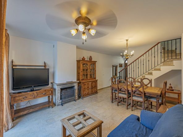 The property is distributed over several floors with a total of three bedrooms, two bathrooms plus a toilet, a living room with a fireplace, a separate kitchen, a porch area, and a terrace.