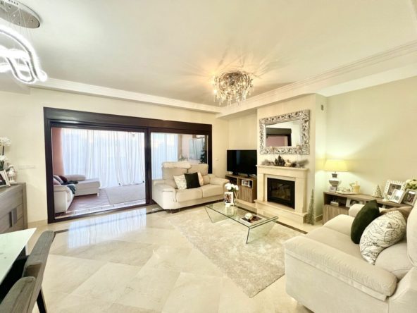 Living room with access to a beautiful enclosed terrace with Lumon glass, perfect for year-round enjoyment.