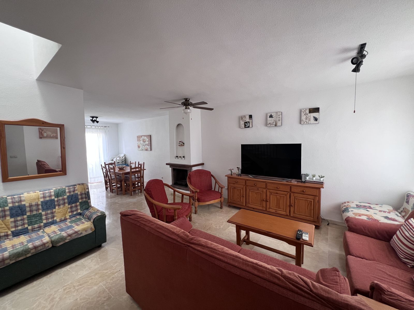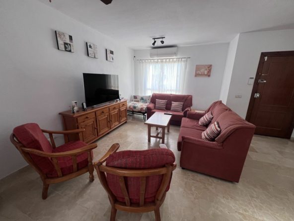 From the dining area, patio doors lead out to a private west-facing patio garden, ideal for enjoying the afternoon and evening sun. To the front, a smaller east-facing terrace provides a lovely spot to relax in the morning sunshine while taking in views of the community gardens, pool area, and La Concha mountain beyond.