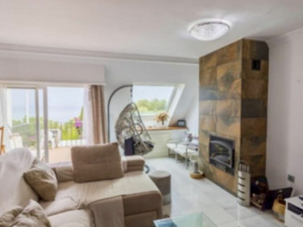 The property features a bright and comfortable living room with fireplace, a fully equipped modern kitchen with high-end appliances, and several outdoor spaces perfect for enjoying the Mediterranean lifestyle. One of the highlights is the sunny terrace with sea views, ideal for outdoor dining and relaxing. There is also a covered porch area with space for entertaining, as well as private outdoor areas that provide both comfort and privacy.