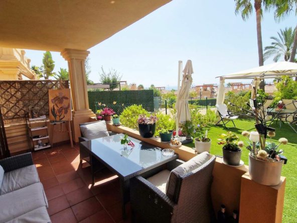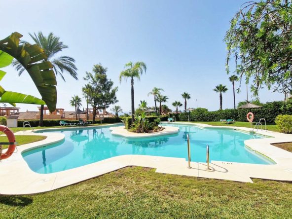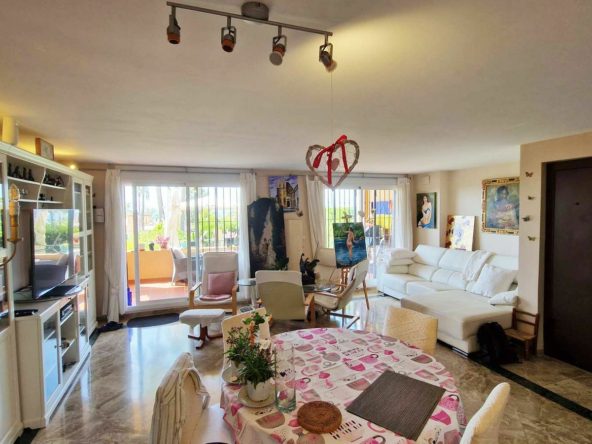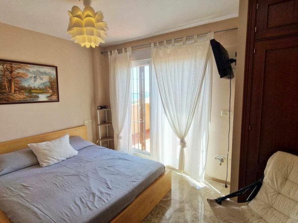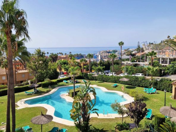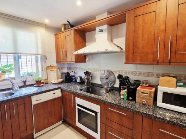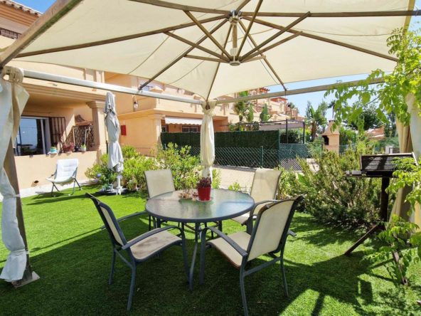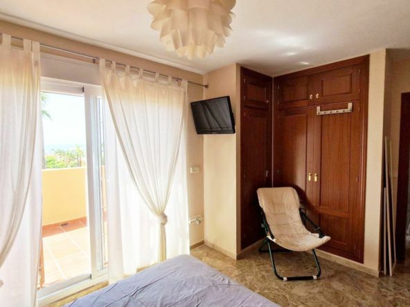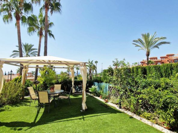 VERY NICE SEMI-DETACHED HOUSE WITH SEA VIEWS FOR SALE IN ESTEPONA!! This corner townhouse is located in the sought-after, secure, private development of Galera Park. Located 200 meters from the seafront, its location within the development protects it from the noise of the coastal road. The house is built on four floors. All floors have an elevator. The first level is the private underground garage, where two vehicles can easily be parked. The owner replaced the garage door with a much better-quality automatic one when he bought the property. The second floor consists of a beautiful living/dining room, a fully equipped semi-open kitchen, and a guest toilet. The living room leads out onto a charming terrace with a bit of sea view and a large, pleasant private green area overlooking the pool and the sea. On the first floor, there are three bedrooms and two bathrooms. The master bedroom has an en-suite bathroom and leads out onto a terrace that provides access to the fourth floor, the solarium, from where you can observe the surroundings and enjoy splendid sea views. You can see the sea from the living room terrace and also from the master bedroom terrace. The house has always been very well maintained by its owners, who even soundproofed the side wall of their only neighbor. Many shops are nearby, including two large supermarkets! This property is being sold partially furnished. All appliances remain. Ideal property for a family, either as a primary residence or for vacations.