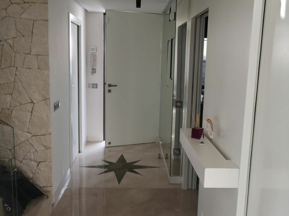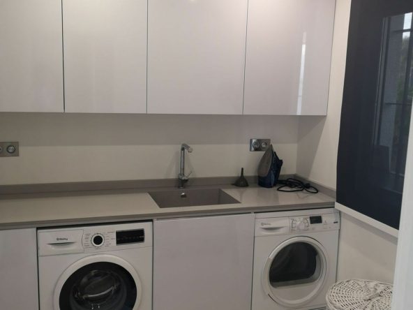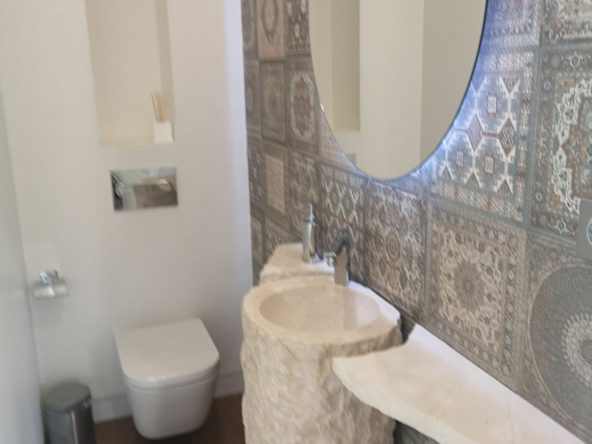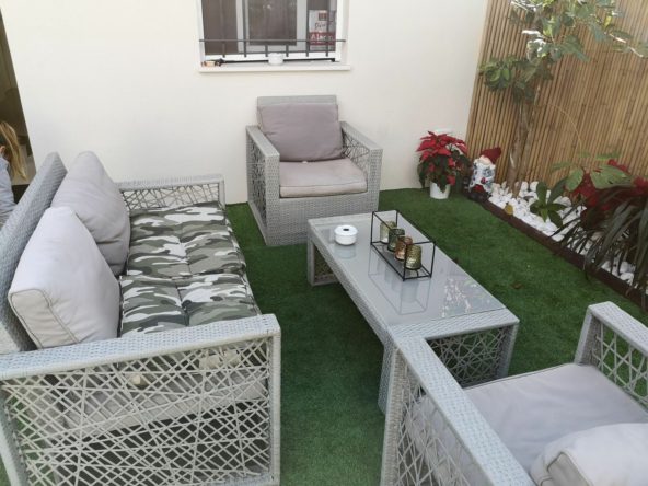 The exterior features a front garden, a rear patio with a covered barbecue area, marble countertops and a set of stairs made of Turkish travertine leading to an elevated second terrace. The property also includes three private underground parking spaces and a storage room, which is a key advantage in this area where parking is limited.