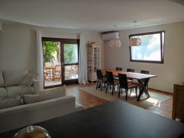 The property has 240 m² built and sits on a 140 m² private plot, featuring three bedrooms and two bathrooms. The home includes a bright living and dining area, a fully fitted kitchen, and direct access to a charming private patio with a barbecue area, ideal for outdoor entertaining.