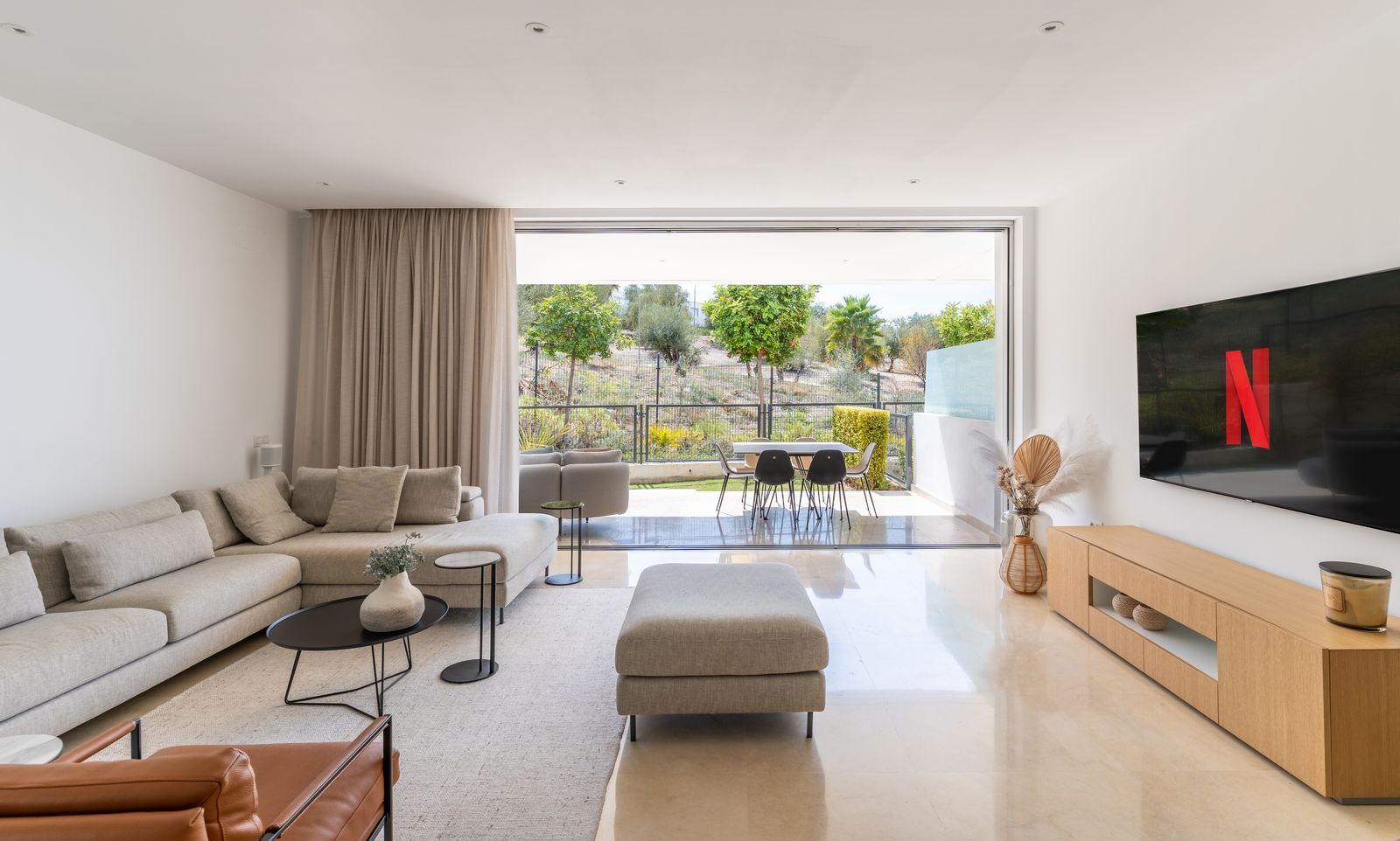 The master suite is located on the first floor and includes built-in wardrobes, an en-suite bathroom and its private terrace. Further there are 2 guest bedrooms with built in wardrobes, which overlook the gardens, and 1 bathroom. All bathrooms have custom made cabinets under the sink.