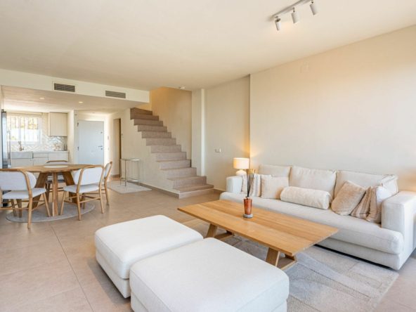 The home is distributed across three levels. On the main floor, you’ll find a bright and spacious open-plan living area with a modern kitchen, seamlessly leading out to a sun-filled terrace. From here, as well as throughout the home, you can enjoy stunning sea views. This level also includes a guest toilet.