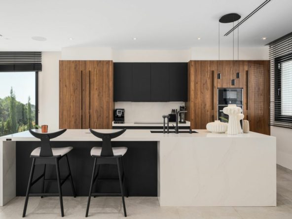 Spread across three levels served by a lift and a wide staircase, the villa is thoughtfully laid out to balance elegance with practicality. It features five spacious en-suite bedrooms (3 of them are in the same level). The design embraces refined materials such as ceramic stone and warm wood finishes, brought together under a sleek architectural vision. High-end details including Miele appliances, solar panels, electric blinds, and an automatic irrigation system underline the home’s intelligent, sustainable engineering.
