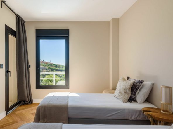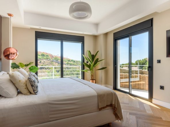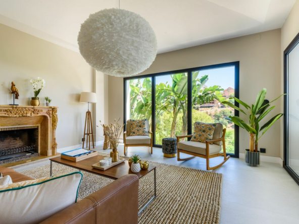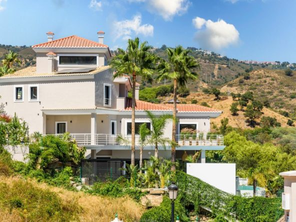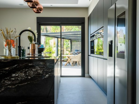 This unique luxury, very modern high-tech villa yet embracing Andalusian charm, is located first line golf to the Santa Maria Golf course offering breathtaking sea views. This very spacious property, situated on a large plot of 1335m2, is fully renovated to the highest standards. It offers seven bedrooms, seven bathrooms and a guest toilet; a home cinema, gym and spa. Due to its hillside location, the villa is divided over five floors which are all accessible via the indoor elevator. The driveway has a carport with solar panels, with enough space for two cars. On the street level, the garage for another two cars is located with an electric car charger, as well as one of the main entrances to the house. On this floor the storeroom and laundry room are located.
