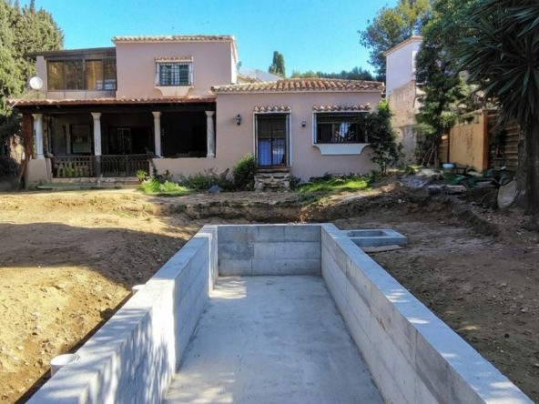 The home features a private garden and a swimming pool currently under construction, measuring approximately 11 meters long by 3 meters wide. The images include renderings showing what the exterior will look like once completed, allowing you to visualize the property’s great potential.