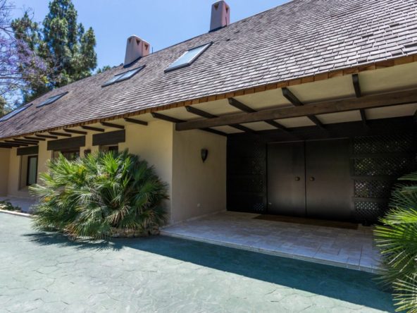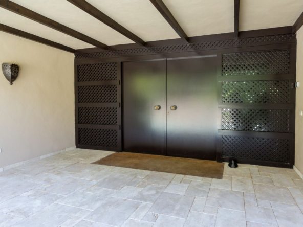 Additional highlights include a garage accommodating five cars, independent hot and cold air conditioning, and a state-of-the-art security system connected to a central control panel. The property is adorned with aged marble flooring on the porch and in the gardens, complemented by exquisite wooden flooring throughout the house. Enjoy the convenience of motorized blinds, heat-resistant glass, and lacquered built-in wardrobes that provide ample storage.