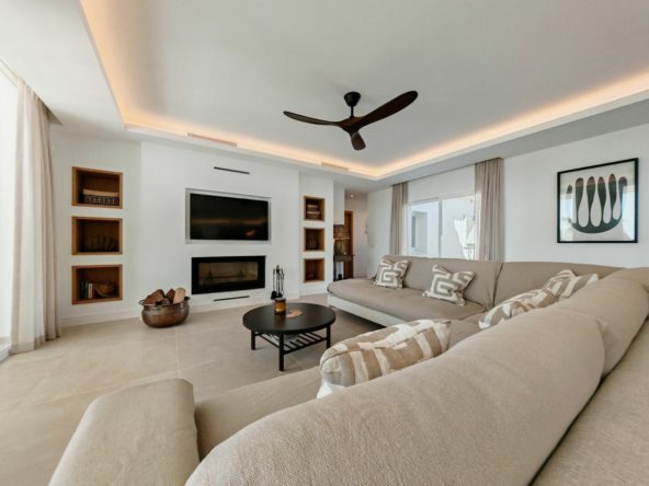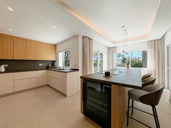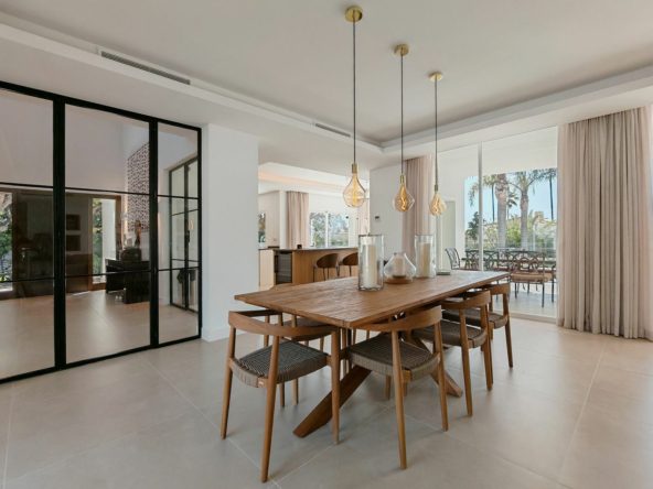 Villa for sale in Elviria, Marbella with 4 bedrooms, 4 bathrooms, 4 en suite bathrooms, 1 toilet and with orientation south, with private swimming pool, private garage and private garden. Regarding property dimensions, it has 327 m² built and 1,519 m² plot. Has the following facilities amenities near, transport near, air conditioning, central heating, fully fitted kitchen, utility room, fireplace, gym, alarm, guest toilet, private terrace, kitchen equipped, country view, mountain view, heated pool, automatic irrigation system, smart home system, laundry room, internet – wi-fi, fitted wardrobes, garden view, close to sea / beach, glass doors, excellent condition, recently renovated / refurbished, close to shops, close to town, close to schools, surveillance cameras, office room and partial sea views.