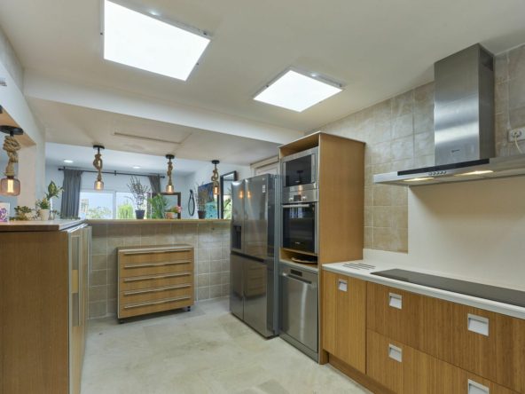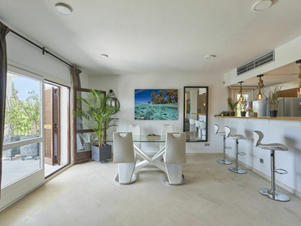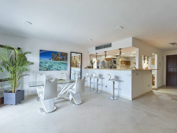 Nestled in a small community with expansive grounds, this three bedroom + bonus room, plus a self contained suite, Semi-Villa features a double-length swimming pool, a paddle court, and stunning views of both the sea to the south and La Concha mountain to the north. Inside, you’ll find marble floors, central air conditioning and heating, a high bar, and a terrace perfect for entertaining guests.