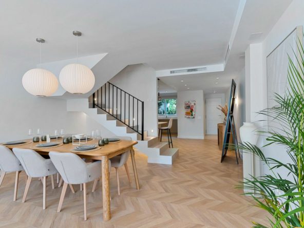 Inside, the ground floor spans nearly 80 m², comprising a stylish open-plan kitchen, spacious living room, entrance hall, and guest toilet. Scandinavian design principles define the space, with carefully selected, high-quality modern materials. Under the staircase, there’s a custom wine storage area. All rooms are fitted with individually controlled Airzone systems for both heating and cooling, while underfloor heating is installed in all bathrooms. Wet areas are finished with tasteful, full-height tiles in a warm beige tone.