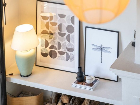 The property welcomes you through a cozy porch entrance, leading into a warm and inviting living room with a fireplace, a guest toilet and a modern open-plan kitchen with a spacious dining area. The entire main floor opens out to an expansive south-facing terrace featuring a dining area, built-in BBQ and views of the Mediterranean Sea—perfect for year-round entertaining.