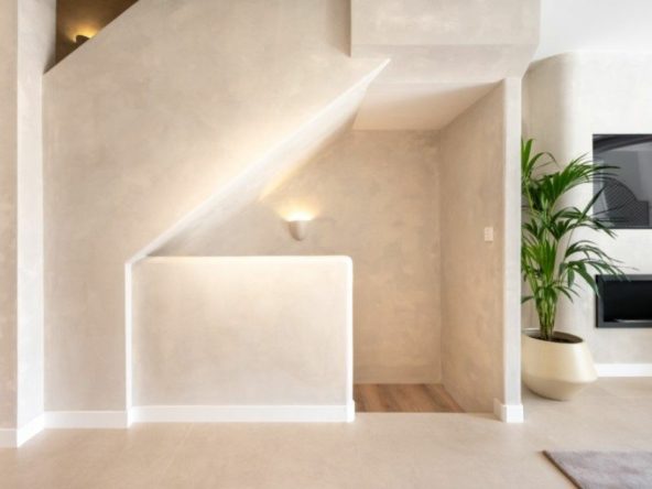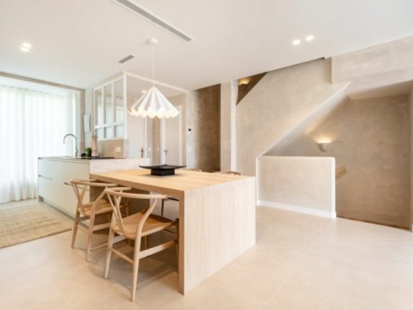 This fully renovated corner townhouse spreads 140 m² of living space across three floors and convinces you from the very first step. The soft palette of microcement walls, warm neutral tones and designer furniture welcomes you instantly. A sculptural pendant light above the solid oak dining table, Wishbone chairs at its side, and a clean built-in electric fireplace that gives the living room the feel of a private villa.