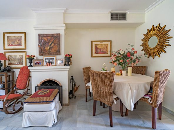 On the main floor is the spacious and bright living room with a fireplace, TV area, lounge and dining room. It has direct access to the open terrace which leads to the communal areas and the swimming pool.