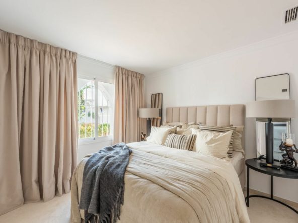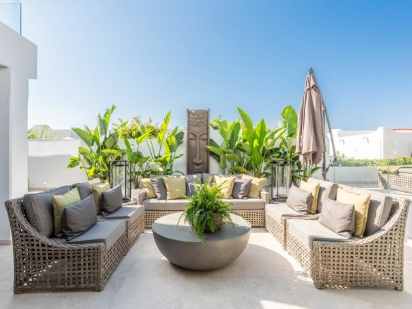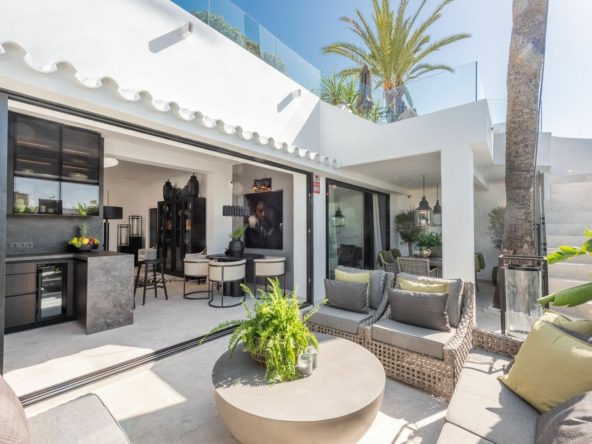 Luxury beach bungalow in Oasis Club, this emblematic beachfront community on the Golden Mile of Marbella. This house has all the living accomodation on the ground level together with a large private terrace with direct access from the living room plus another terrace upstairs with wonderful sea views. Total built area is 189 sq.m. The house has just been completely refurbished using only the best quality materials resulting in a very stylish and elegant finish. A mediterranean exterior with a scandinavian feel in the interior! It is the perfect residence for someone who demands quality living in an A1 location.