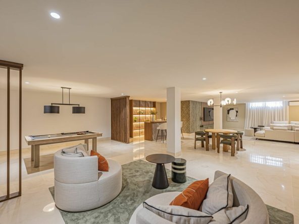 Elegant contemporary-style villa spread over three and four floors with a total of five bedrooms, five bathrooms, a large living room with an open-plan kitchen and dining area, a spectacular basement with a home theater, bar, billiards table, and a large solarium with beautiful sea and mountain views.