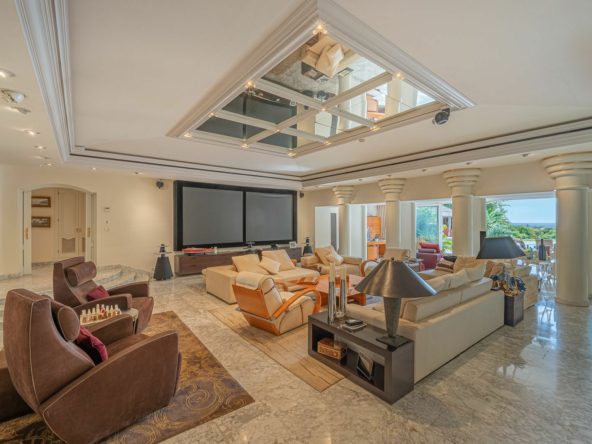 Set on a generous plot, the 640 m² villa is distributed over two levels. The main floor features a welcoming entrance hall leading into a spacious and bright living room with sea views and direct access to the pool area, surrounded by a lush tropical garden. This level also includes a dining room, a fully equipped kitchen, and four generously sized bedrooms, each with its own en-suite bathroom.
