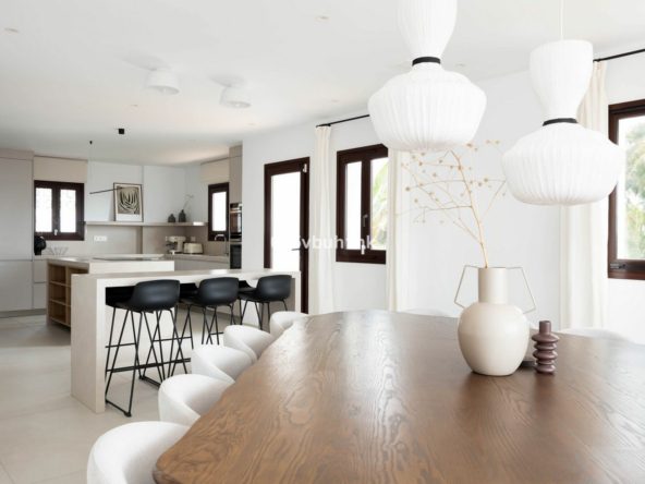 At the heart of the villa lies a kitchen by Porcelanosa, its open-plan layout flowing naturally into a breakfast nook and dining area. Both functional and inviting, it is conceived as a stage for culinary creativity and convivial gatherings. Technical features, including full air conditioning and underfloor heating in six of the eight bathrooms, ensure comfort throughout, with thoughtful exceptions in the external cabana shower, the entrance hall guest WC, and the newly added downstairs bathroom.