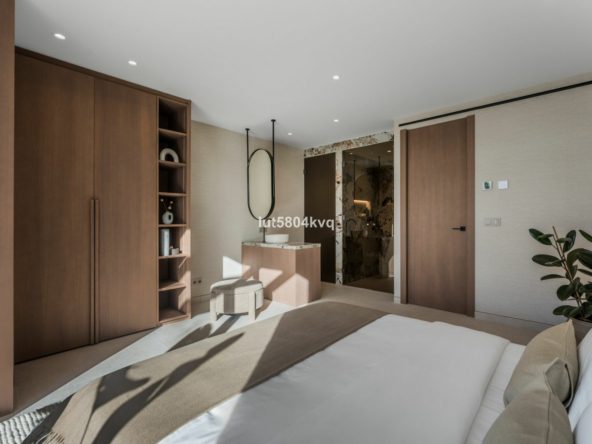 Upstairs, the villa features three generously sized en-suite bedrooms, each thoughtfully designed for comfort, privacy, and natural light. The master suite, located on this level, is a true highlight—featuring a stylishly centered bed, a spacious walk-in wardrobe, and a luxurious en-suite bathroom. This serene retreat offers uninterrupted panoramic views of both La Concha Mountain and the Mediterranean Sea, creating a breathtaking visual experience from the moment you wake.