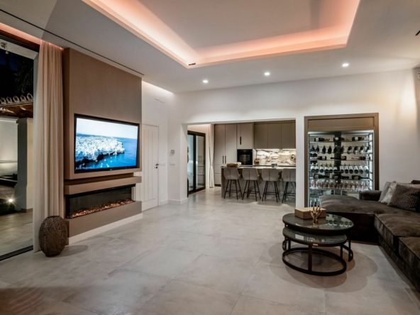 The main level of the house welcomes you with spacious open-plan areas flooded with natural light, featuring floor-to-ceiling windows that showcase the stunning surroundings. The living area seamlessly flows into a dining area, comfortably seating eight guests, and a high-quality Aster kitchen, perfect for culinary enthusiasts. With direct access to all exterior spaces, including private terraces, the indoors effortlessly blend with the outdoors.