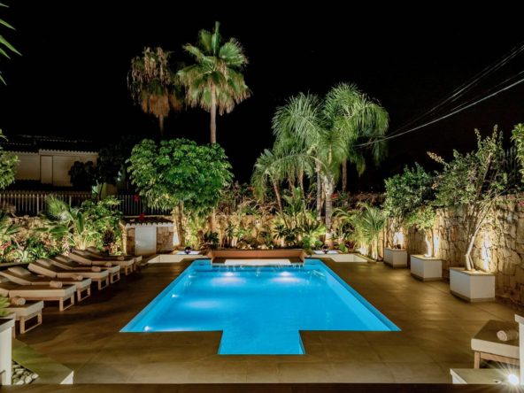 Descending to the pool and garden level, you'll discover three additional ensuite bedrooms, each with fitted wardrobes and their own terraces, ensuring every guest enjoys their own slice of paradise. Exterior areas abound with spacious open areas and terraces, including a wooden pergola covering a dining area for twelve, ideal for alfresco dining under the stars.