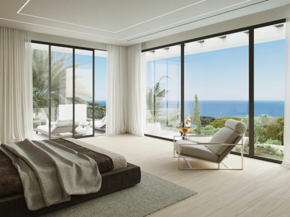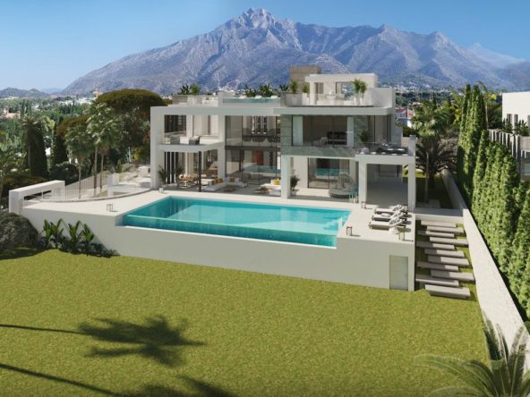 This project is a unique luxury south facing villas, which has an unbeatable location of the most prestigious area of the Golden Mile,gated community in Marbella.The development are projected by modern architecture with the idea to enjoy the views of the Mediterranean Sea and Sierra Blanca from any space of the house.The outside territory is created in the same style as the house and is its harmonious continuation. The picturesque plot of 1.850 m² has a landscaping garden , a modern swimming pool, BBQ, an outdoor parking for 3 cars.Built with high quality materials, villa has façade finished with large porcelain blocks siding with careful attention to details, including unusual architectural features and quality equipment and technology, marble and oak flooring (in the bedrooms) electric heating in whole house, an elegant lighting solution, electric shutters, innovative solutions from Schüco's Windows systems