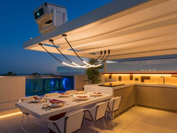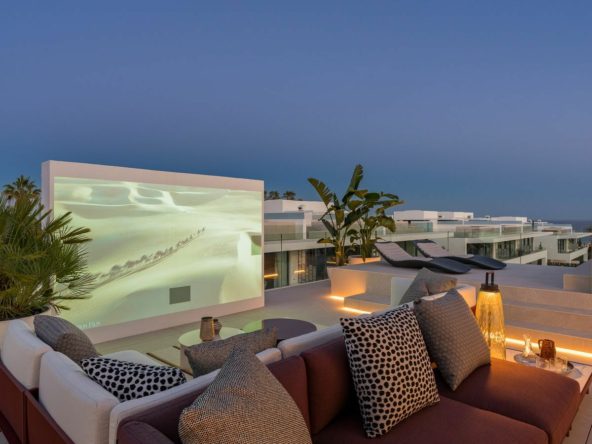 The rooftop terrace is an entertainer's paradise, featuring an outdoor kitchen, a private pool, and a top-of-the-range projector that transforms the space into a captivating open-air cinema at night. Every detail in this villa speaks of the highest possible quality and luxury, from natural oak wooden doors to a high-end domotic system.