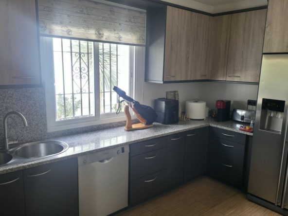 The house is constructed on one level and consist of: entrance hallway, large and luminous living room with a semi-separate dining room and also a small study/TV-room. Guest toilet in the entrance hall. Fully fitted kitchen with a utility room and another guest toilet and also direct entrance from the parking area.