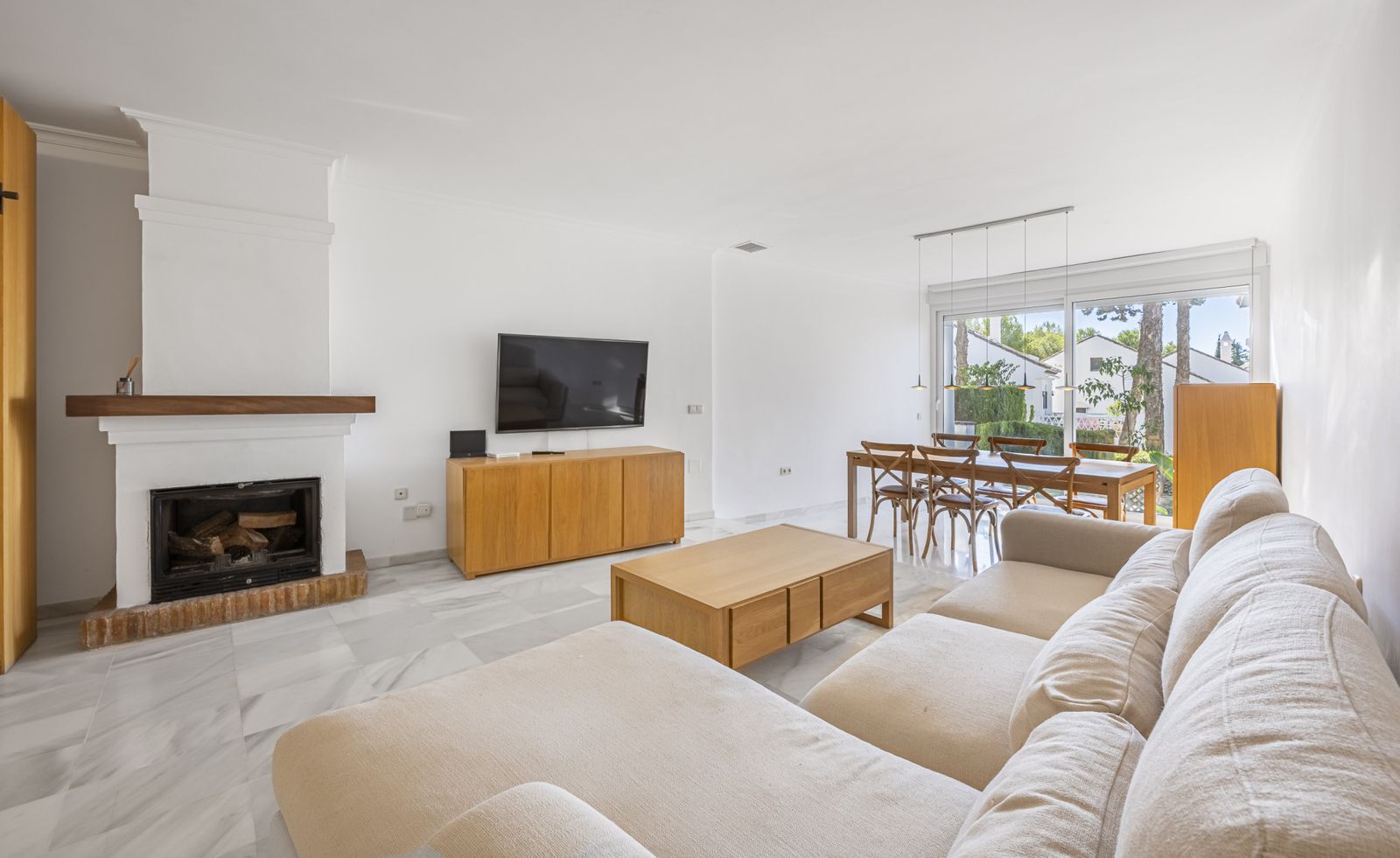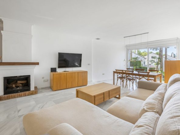 On the main floor there is a spacious and bright living room with a fireplace, separate television, living and dining areas, and direct access to an open terrace with access to the communal areas and swimming pool.