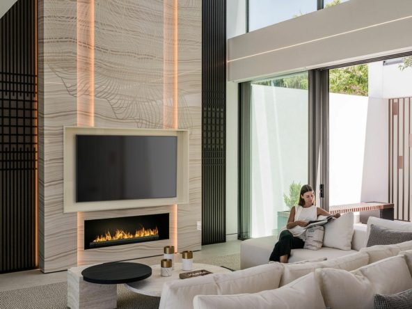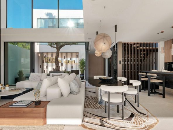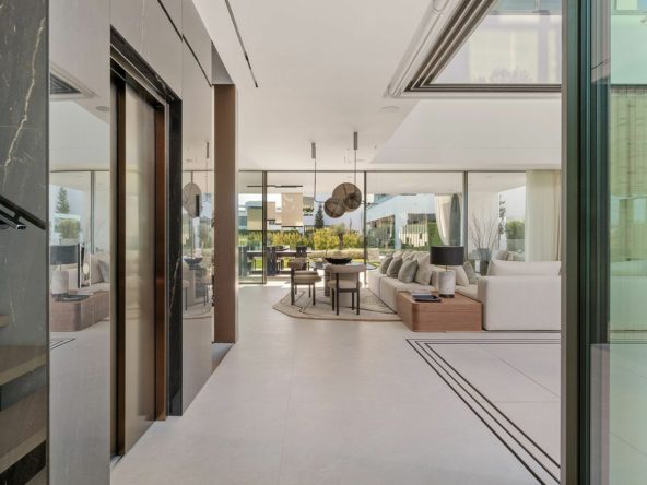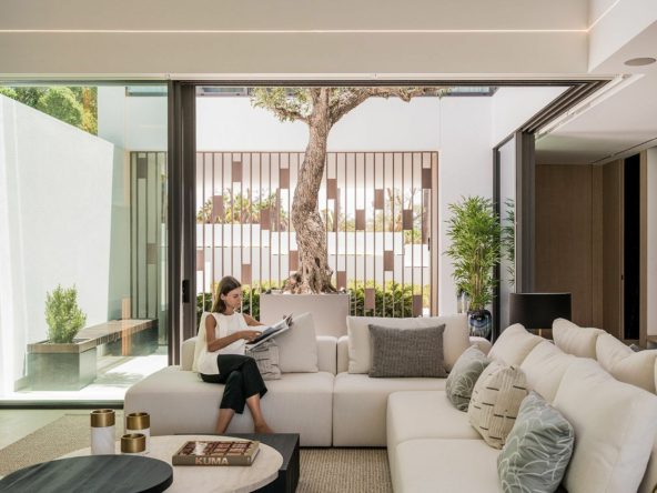 This villa spans four meticulously designed floors, connected by a private elevator. The spacious living area features a dramatic double-height ceiling, creating an airy, open atmosphere ideal for entertaining. This flows seamlessly onto a beautifully crafted terrace, perfect for embracing the indoor/outdoor lifestyle. The interior patio, complete with a mature olive tree, further enhances the villa’s expansive feel, blending nature and design. The state-of-the-art Gaggenau kitchen is a chef’s dream, equipped with top-of-the-line appliances, combining style with practicality.