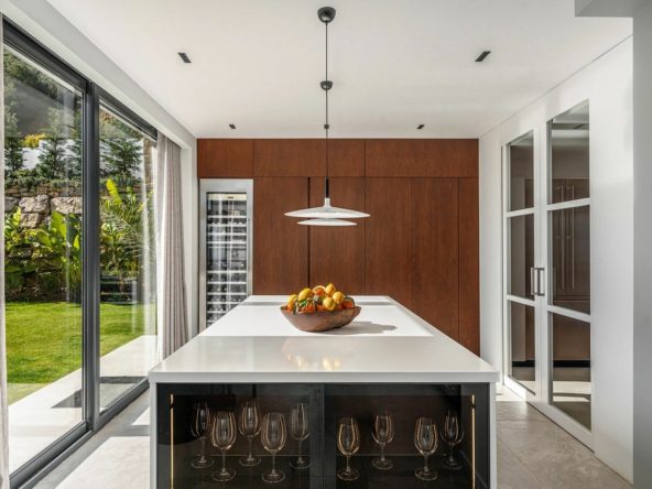 Recently rebuilt under the supervision of the award-winning design and construction studio Roomzly, the villa has been conceived to integrate contemporary architecture, comfort, and a lifestyle centered on light, space, and well-being. With approximately 640 m² indoors, the home is organized into spacious open-plan areas framed by floor-to-ceiling windows capturing panoramic views of the Mediterranean and the surrounding mountains.