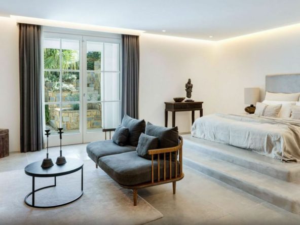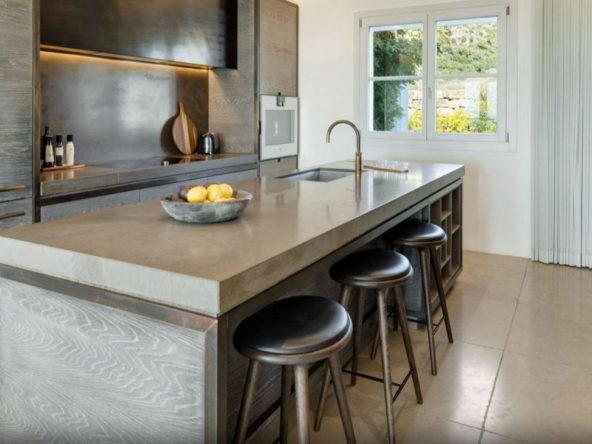 The ground floor also includes two spacious en-suite bedrooms, each with direct access to the landscaped gardens adorned with exquisite stonework, creating a serene atmosphere. The open-plan modern kitchen, equipped with high-end Gaggenau appliances, combines sleek Scandinavian design with superior functionality, making it perfect for daily use or hosting guests.