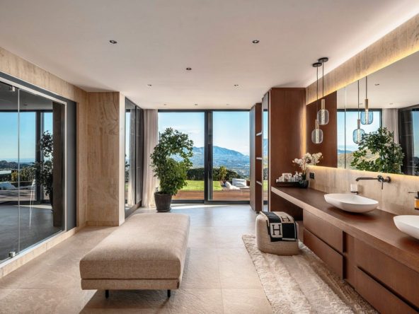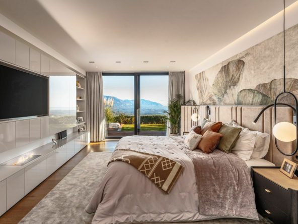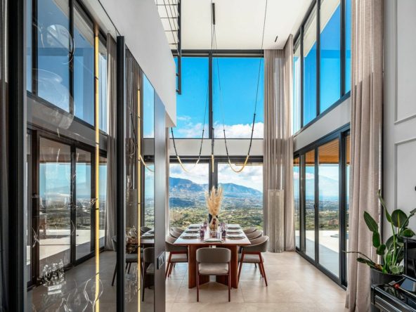 Recently rebuilt under the supervision of the award-winning design and construction studio Roomzly, the villa has been conceived to integrate contemporary architecture, comfort, and a lifestyle centered on light, space, and well-being. With approximately 640 m² indoors, the home is organized into spacious open-plan areas framed by floor-to-ceiling windows capturing panoramic views of the Mediterranean and the surrounding mountains.