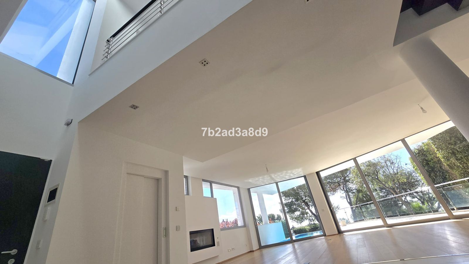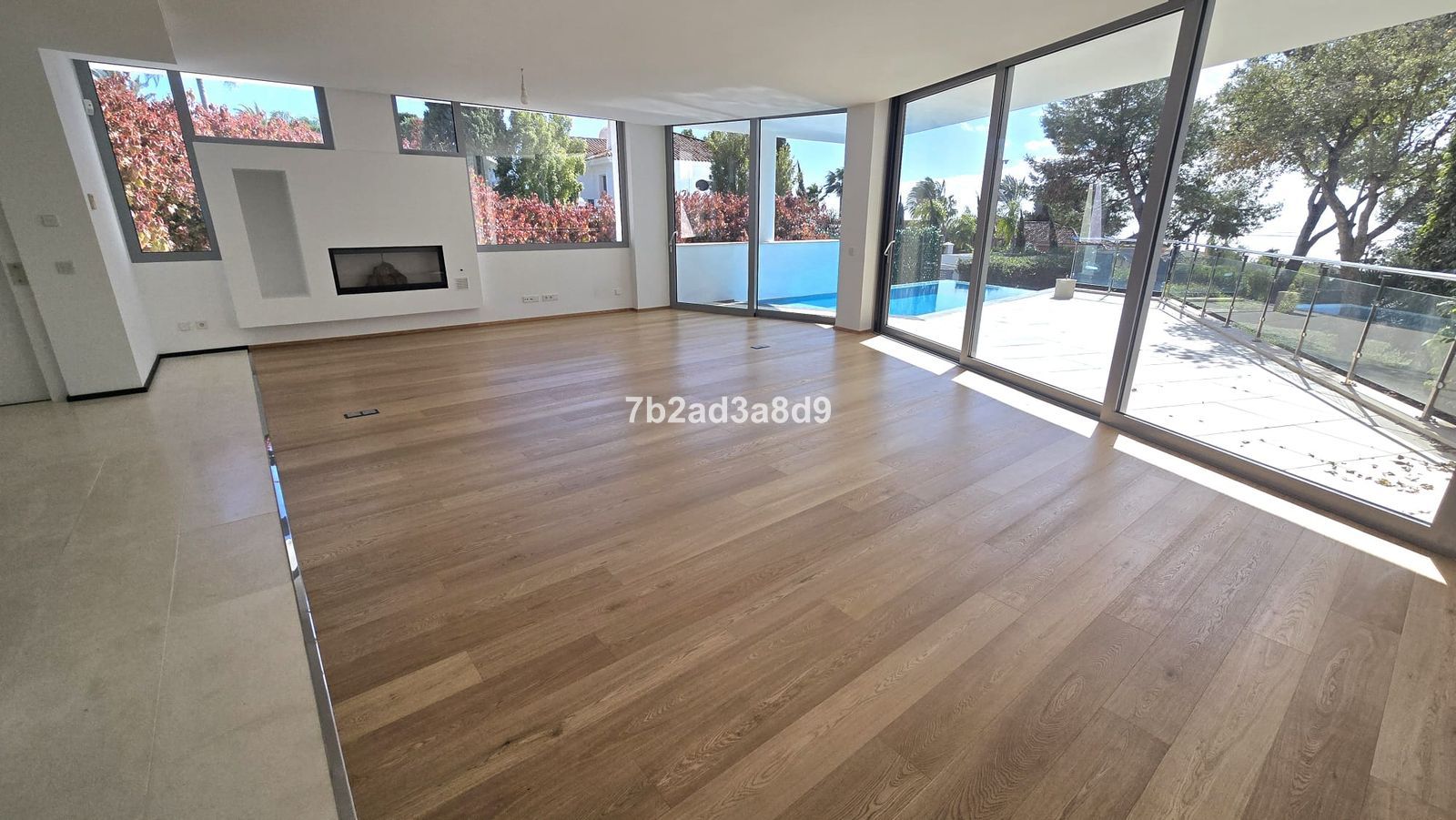 The bright open-plan living area features natural oak flooring, a fireplace, and floor-to-ceiling windows that open onto a spacious terrace with a private swimming pool. Glass balustrades enhance the modern design while maximizing light and views. The sleek contemporary kitchen includes a central island and integrated appliances.