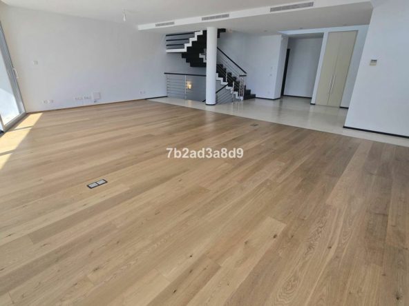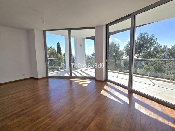 All bedrooms enjoy access to a wraparound terrace and offer built-in wardrobes, large glass doors, and light wood flooring. The elegant bathrooms are finished to a high standard with walk-in showers, bathtubs, and heated towel rails.