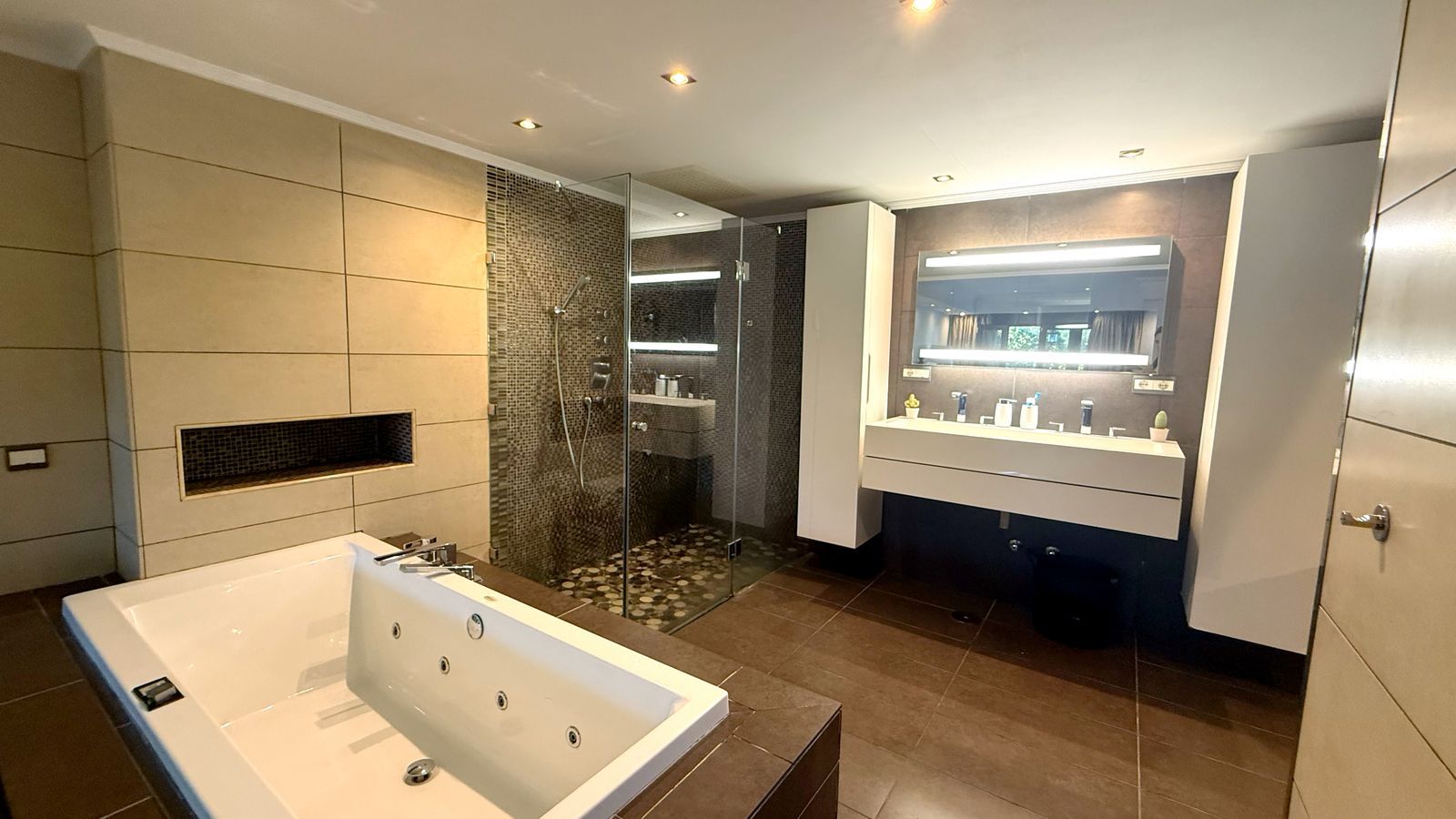 The villa’s meticulously landscaped garden is a true highlight, offering a private swimming pool, ideal for cooling off on warm days. An inviting barbecue area and a pergola create the perfect setting for alfresco dining and gatherings with family and friends. The outdoor space is designed for both relaxation and entertainment, providing a seamless blend of luxury and nature.