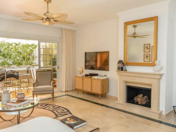 Ground floor: guest toilet, a bright living room with fireplace, fully fitted kitchen, and access to a charming private patio with a small pool, leading directly to the lush tropical communal garden with a large shared swimming pool.